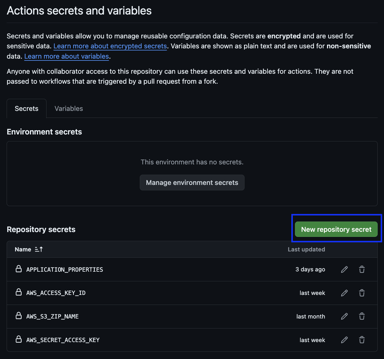 그러면 아래와 같이 나오는데, New repository secrets를 누르셔서 API 키, 토큰 등 노출되면 안되는 정보들을 넣어줍니다. cd.yml에 applicatios.properties를 생성하실 수 있으니 properties파일을 통째로 넣으셔도 됩니다.(이 때, github에 properties 파일은 삭제해주시고 올려주시면 됩니다.)