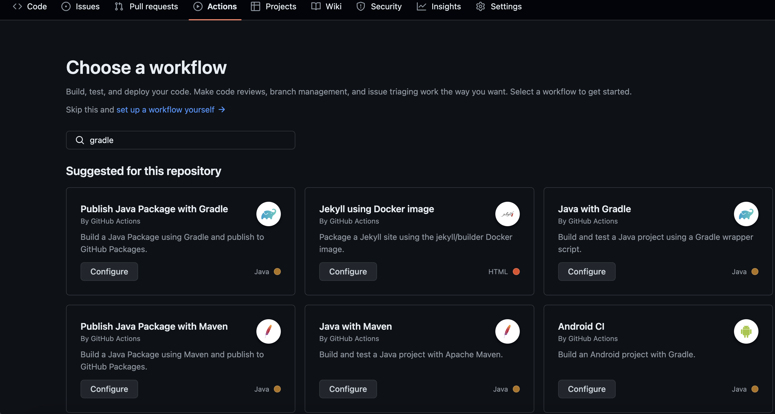 우선 actions에 가면, 아래와 같이 나오는데, 자신의 설정에 맞는 ci.yml파일을 찾을 수 있습니다. 저는 여기서 배포할 branch 설정과 dependency-submission을 지우는 것 정도만 수정했습니다. configure를 누르시면, repository/.github/workflows/ 위치에 ci.yml 파일을 자동생성해줍니다.
